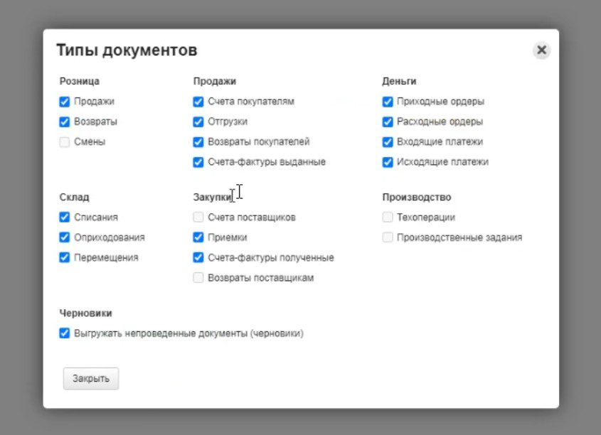 После выбора типа выгружаемых данных настройте необходимые виды документов, отмечая галочками нужные позиции. Затем нажмите «Закрыть», укажите период и даты исправлений для выгрузки.