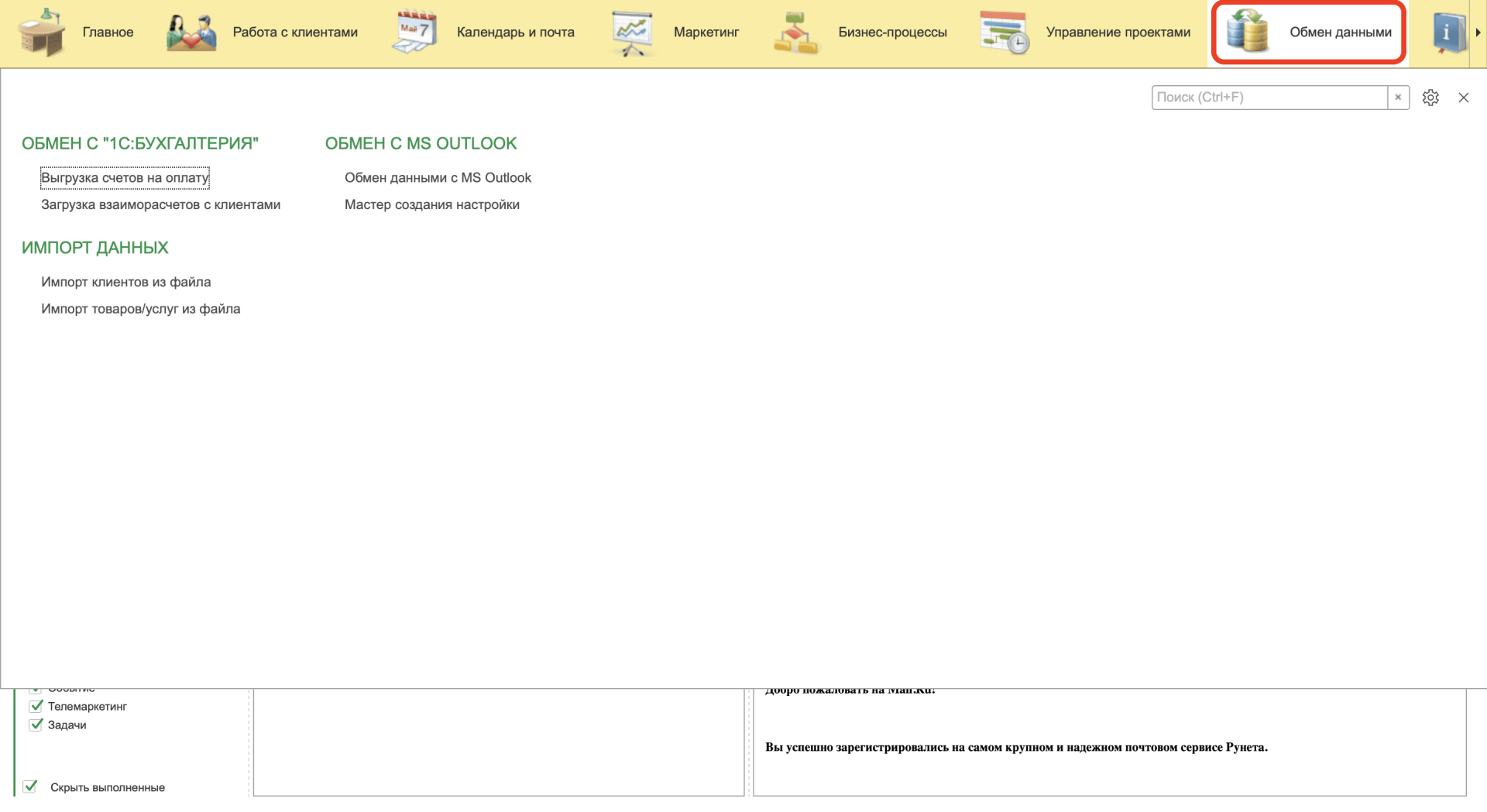 Программа позволяет обмениваться информацией между 1С: CRM и другими приложениями, такими как 1С: Бухгалтерия и MS Outlook.