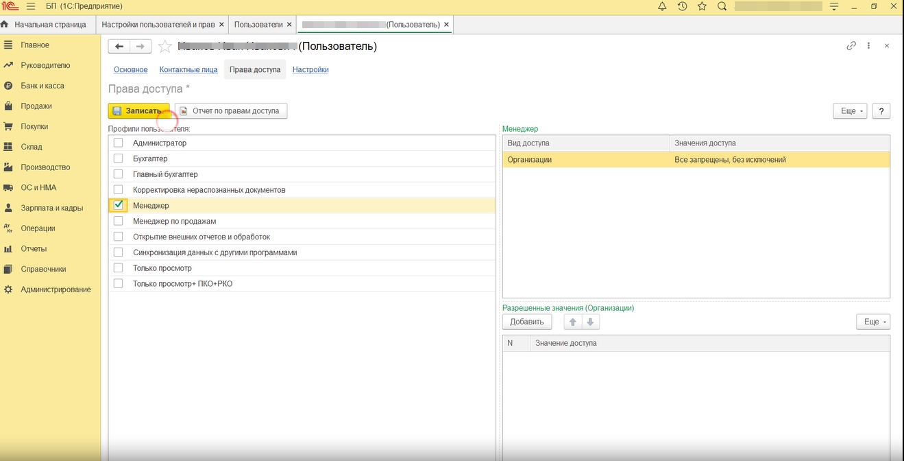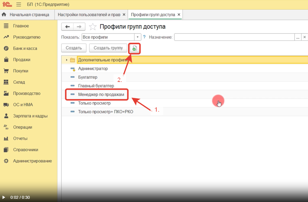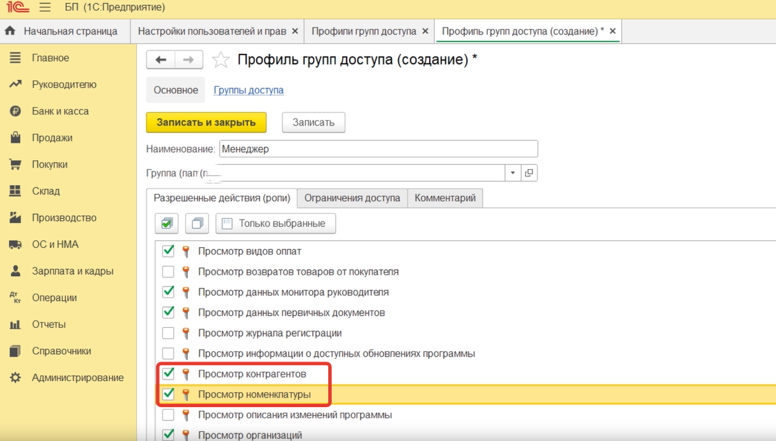 Например, скопируйте профиль "Менеджер по продажам" и добавьте права на "Просмотр контрагентов" и "Просмотр номенклатуры", назвав новый профиль "Менеджер".