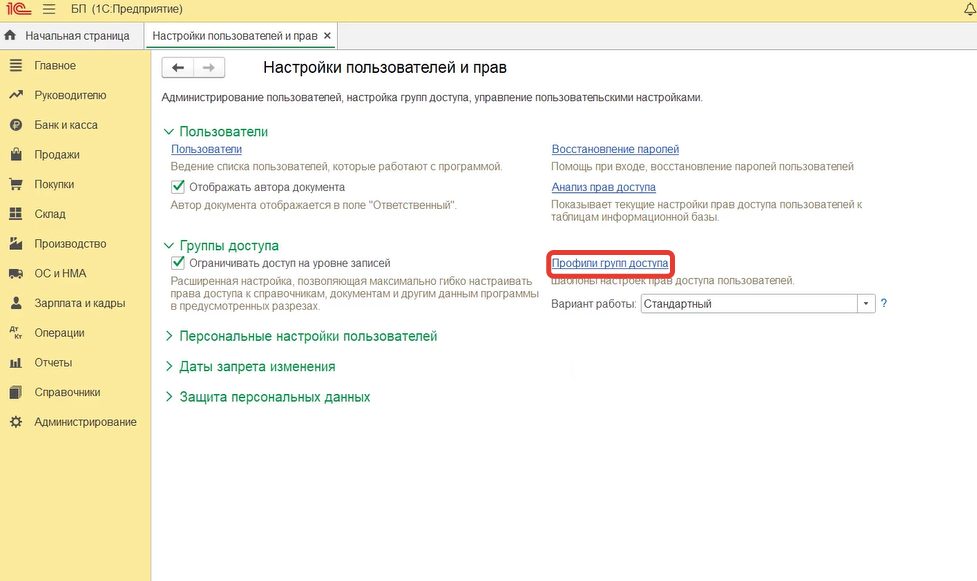 Если необходимо более точно настроить права, можно создать свой профиль. Для этого вернитесь в "Настройку пользователей и прав": "Группы доступа" → "Профили групп доступа".