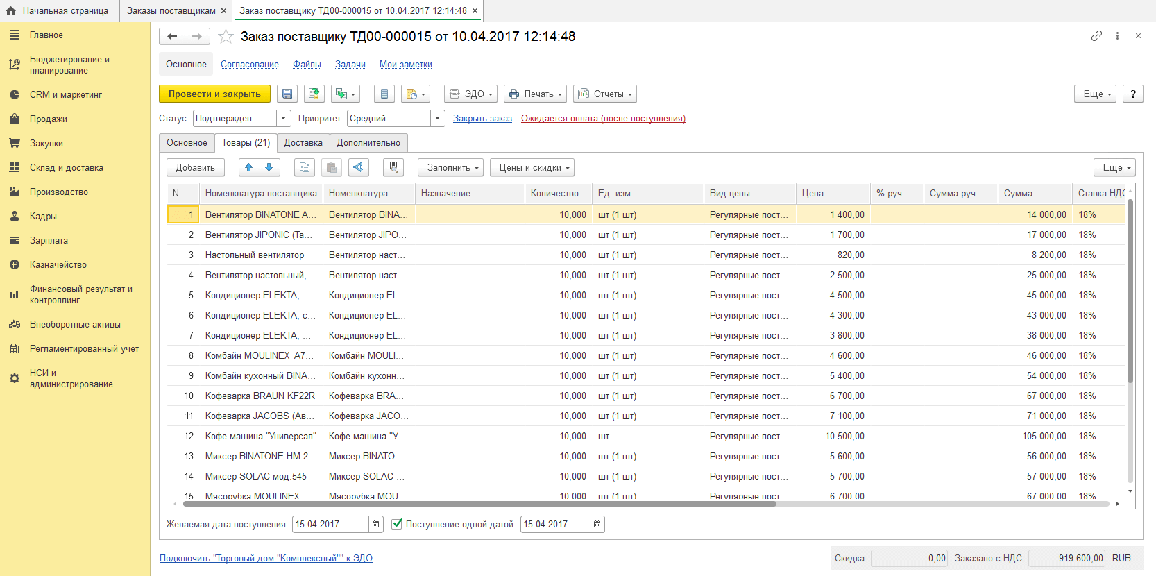 Важный этап закупочного процесса, позволяющий фиксировать договоренности о сроках и условиях поставки, а также контролировать оплату. Заказы на поставку можно создавать автоматически или на основе уже созданных заказов. Заказы поставщикам позволяют эффективно планировать приобретение товаров и отслеживать соблюдение обязательств контрагентов. Оплата продукции осуществляется согласно установленным датам, что минимизирует задержки и финансовые риски.