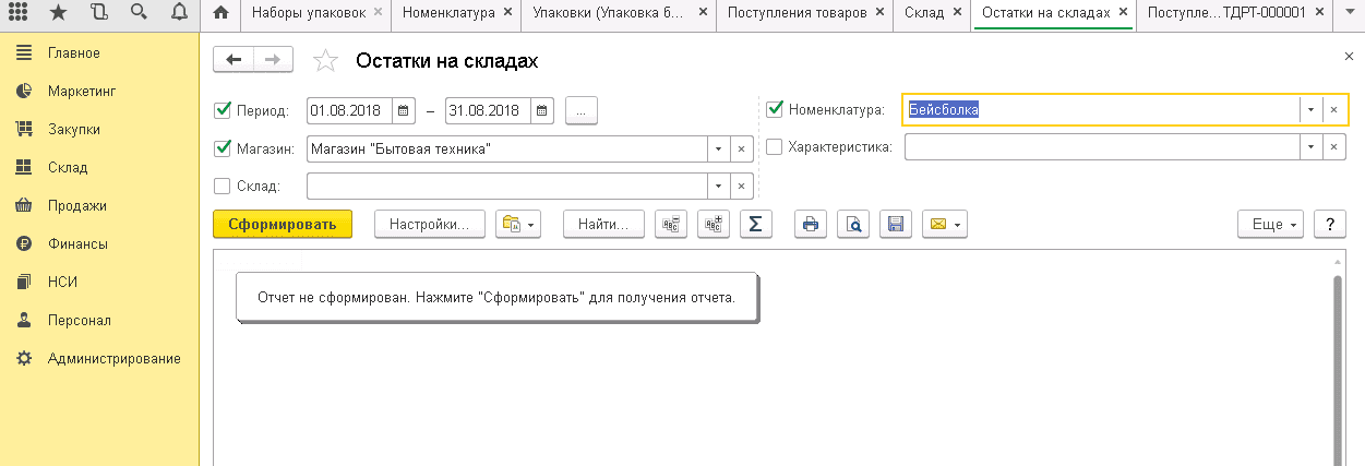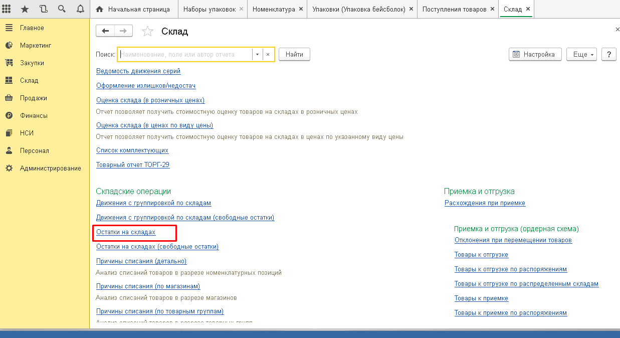 1. Открыть раздел "Склад" и перейти "Отчеты по складу".