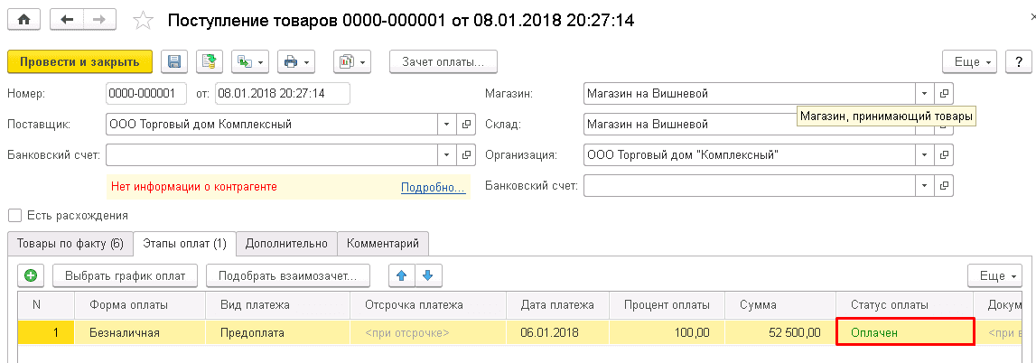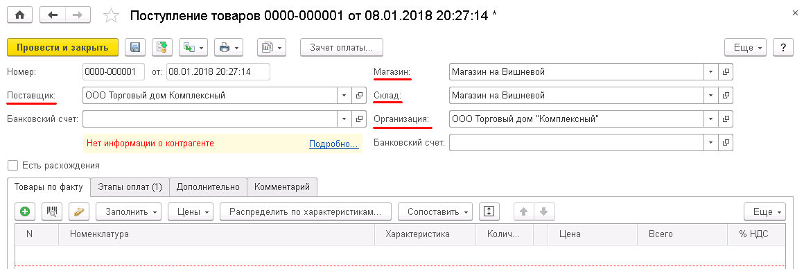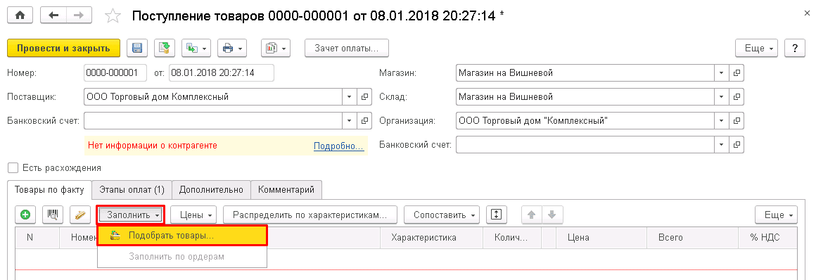 - Поставщик: выберите нужного контрагента из предложенного списка.