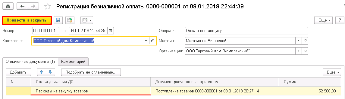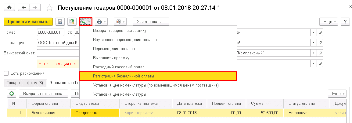 - Безналичный расчет. Чтобы отобразить факт оплаты, создайте документ «Регистрация безналичной оплаты» на основании документа «Поступление товаров»: