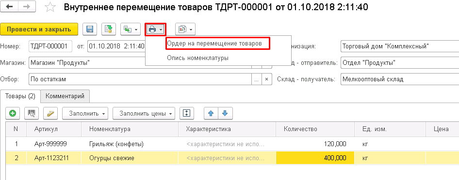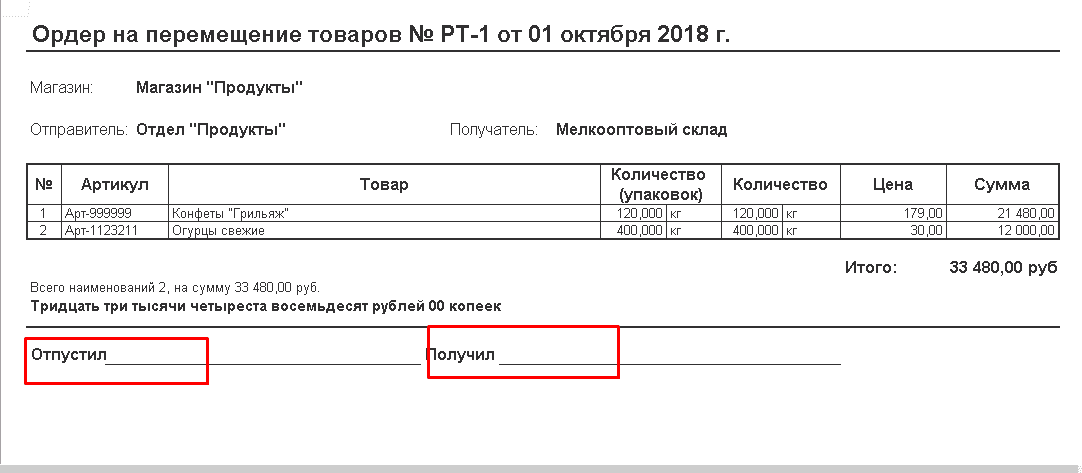 Для печати формируется ордер на перемещение товаров.