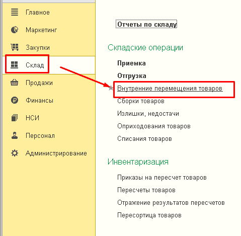 Чтобы это осуществить, необходимо открыть вкладку "Склад", затем "Внутреннее перемещение товаров" и выбрать "Создать".