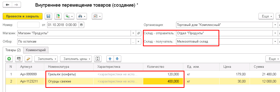 Организация: выберите компанию, осуществляющую перемещение и выберите компанию, для которой выполняется перемещение. Магазин: укажите магазин, для которого выполняется перемещение. Склад: выберите склад, с которого осуществляется отправка и укажите склад, на который осуществляется доставка. В документе необходимо указать наименование товара, его количество, характеристики, а также при необходимости — серии и сроки годности.