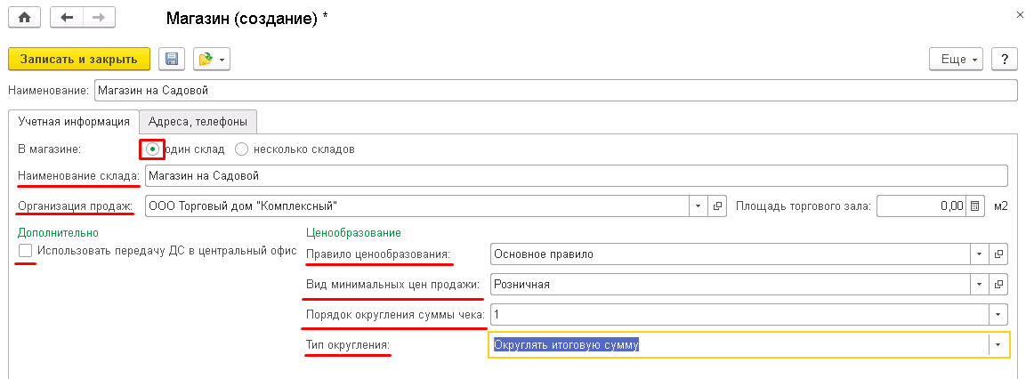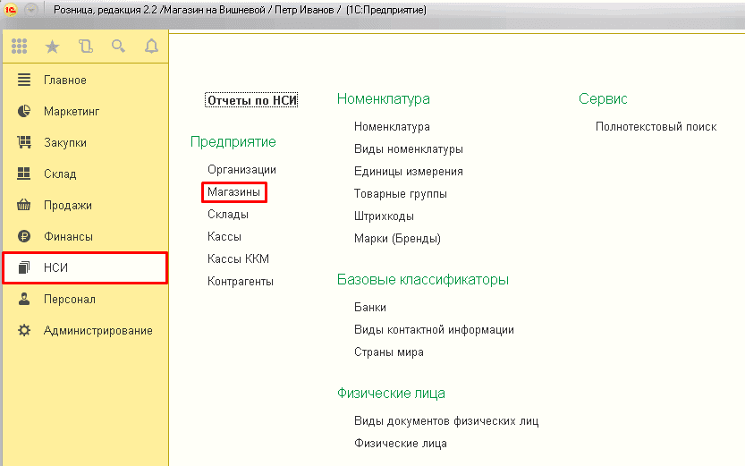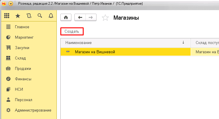 Данные о торговых точках вносятся в справочник "Магазины". Под торговой точкой понимается обособленное подразделение торговой организации, предназначенное для продажи товаров и услуг конечному потребителю. В программе 1С: Розница может быть несколько магазинов, что позволяет переносить товары между ними, устанавливать различные цены на одинаковые товары и просматривать остатки на разных торговых точках в едином отчете. Чтобы открыть новую торговую точку, выполните следующие действия: