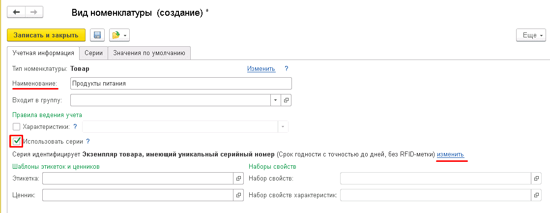 "Серии" в карточке вида номенклатуры: