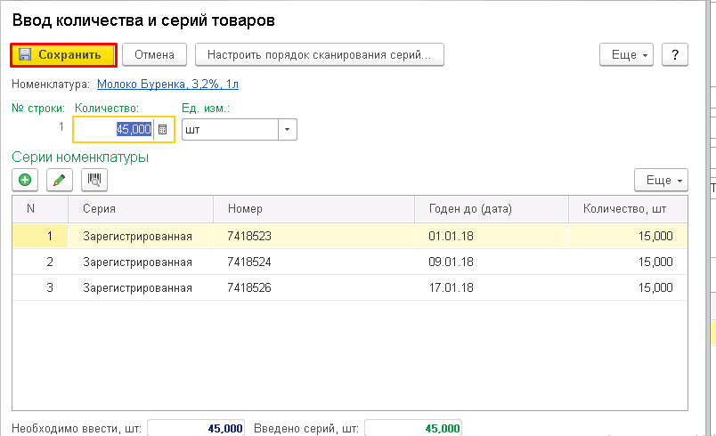 При клике на ячейку "Количество" откроется окно "Ввода количества и серий". Укажите три серии товара с разными сроками годности и нажмите "Сохранить".