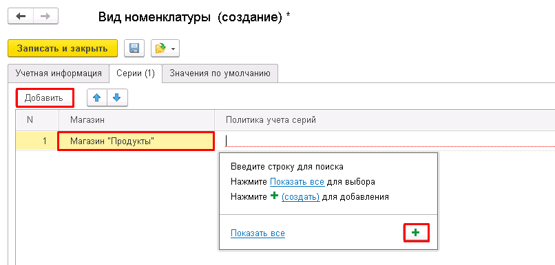 "Добавить" и выберите магазин, в котором будет вестись учет по сериям.