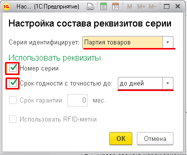 В появившемся окошке установите галочку "Номер Серии" и "Срок годности с точностью до дней". Выберите параметр