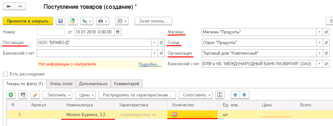 Перейдите в раздел "Закупки" – "Поступление товаров" и нажмите "Создать". В карточке документа выберите поставщика, магазин, склад и организацию. В табличной части добавьте номенклатуру.