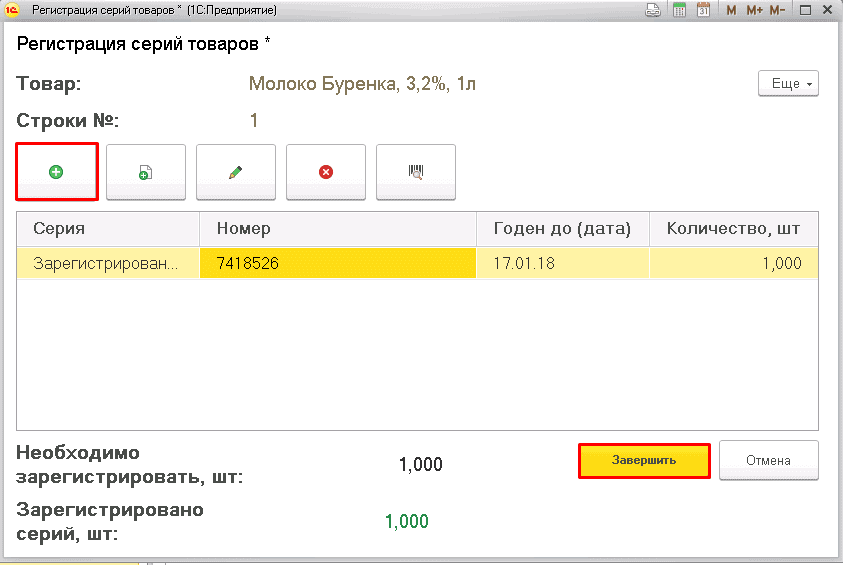 Перейдите в "Рабочее место кассира". Выберите товар с сериями. При выборе откроется раздел "Регистрация серий товаров". Нажмите "Добавить" или кнопку "Штрихкод" (номер серии используется как штрихкод). Введите номер серии и нажмите "Завершить".