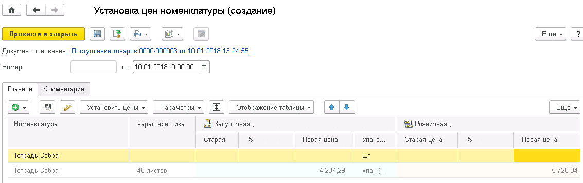 На основании "Поступление товаров" сформируйте прайс номенклатуры. Нажмите "Установить цену" – "Рассчитать" стоимость товара". Система автоматически рассчитает стоимость одной единицы исходя из стоимости всей партии. Нажмите "Провести" и "Закрыть".