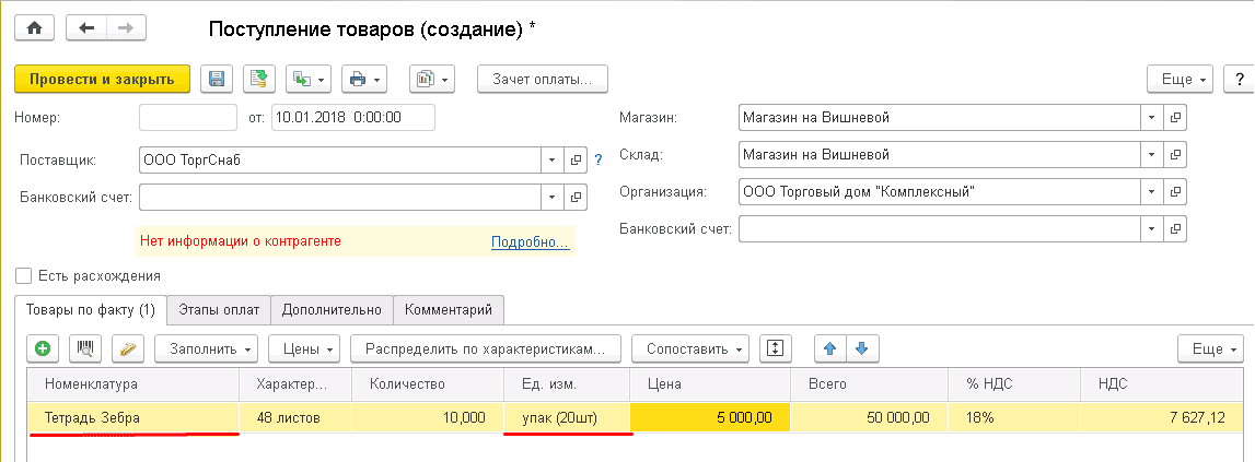 Перейдите в раздел "Закупки" – "Поступления товаров" и создайте новый документ. Заполните шапку документа. В табличной части выберите номенклатуру, укажите "упаковка", а также цену и число поступивших упаковок.
