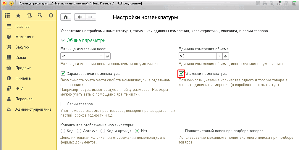 Начнем с включения опции работы с упаковками в номенклатуре.
