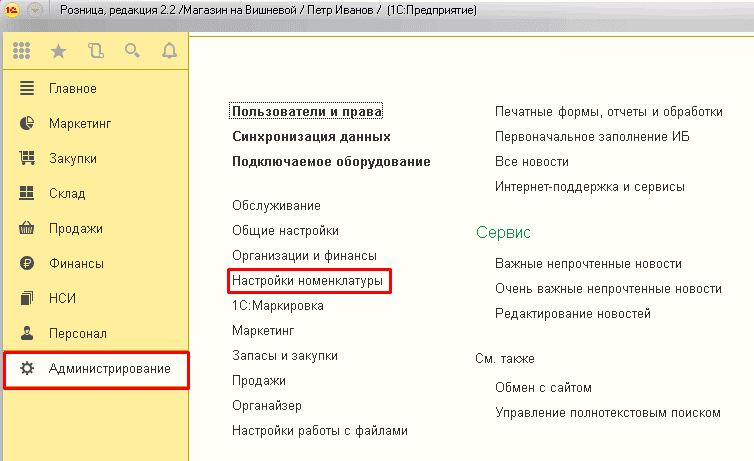 Перейдите к разделу "Администрирование" – "Настройки" номенклатуры".