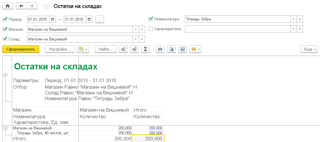 В отчете отобразится, что на склад поступило 200 штук тетрадей (20 упаковок по 10 штук).