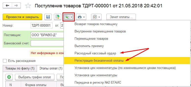 Для проведения оплаты нажмите кнопку "Создать на основании" и выберите "Расходный кассовый ордер".