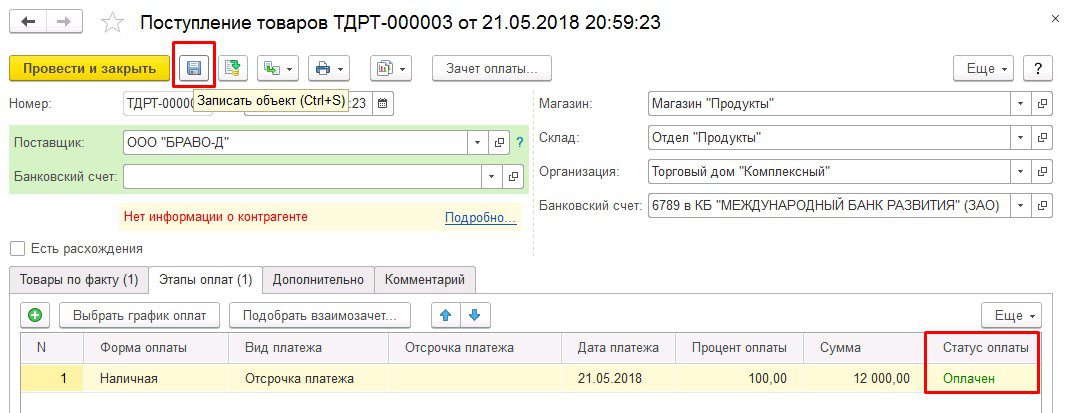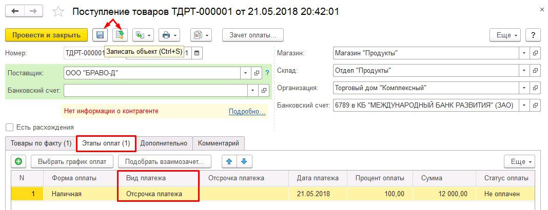 Затем перейдите на вкладку "Этапы оплат" и нажмите кнопку "Записать" и "Провести". В документе отобразится информация о первом виде платежа - отсрочке платежа.