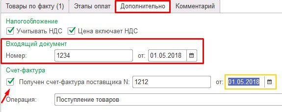 Перейдите на вкладку "Дополнительно" и укажите номер входящего документа и его дату. Если у вас есть счет-фактура, отметьте соответствующую строку и укажите номер и дату.