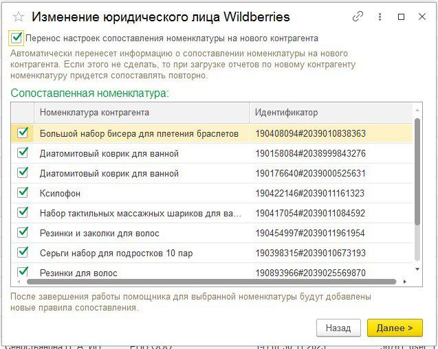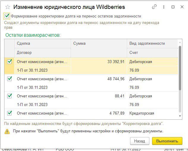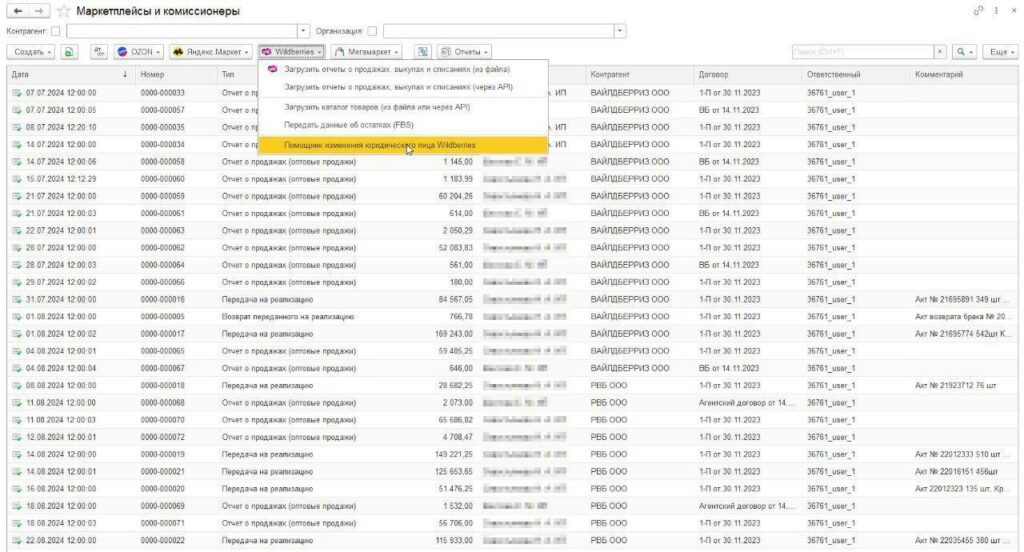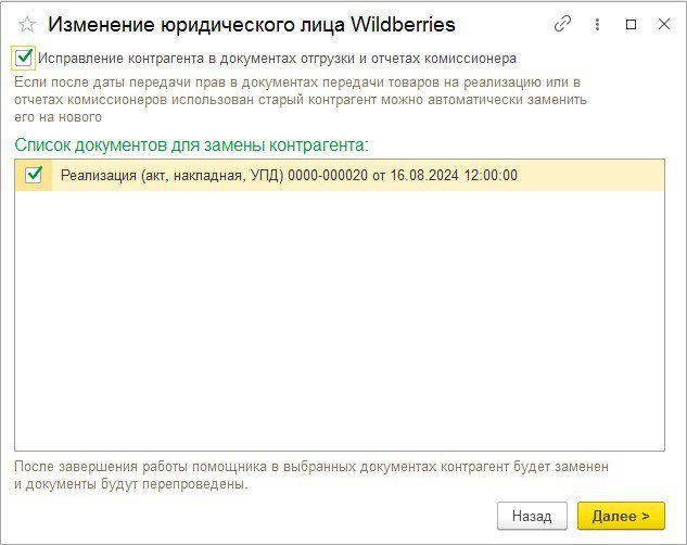 - Воспользуйтесь Помощником смены юридического лица Wildberries. В версии БП 3.0.159 в разделе «Продажи» → «Маркетплейсы и комиссионеры» → «Wildberries» - появился помощник для смены юридического лица. Запустите его, чтобы выполнить следующие действия: - Заполните историю контрагента в настройках интеграции. - Перенесите остатки отгруженных товаров на дату передачи прав. - Исправьте контрагента в документах отгрузки и отчетах комиссионера. - Перенесите настройки сопоставления номенклатуры на нового контрагента. - Сформируйте корректировки долга для переноса остатков задолженности.