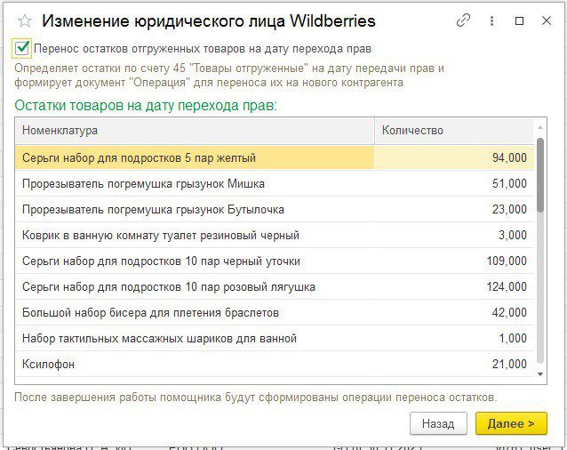 - Остатки товаров. На этапе проверки помощник покажет все остатки товаров на дату передачи прав. Убедитесь, что все данные корректны.