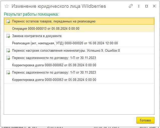 Теперь вы успешно перенесли остатки с ООО «Вайлдберриз» на нового контрагента ООО «РВБ».