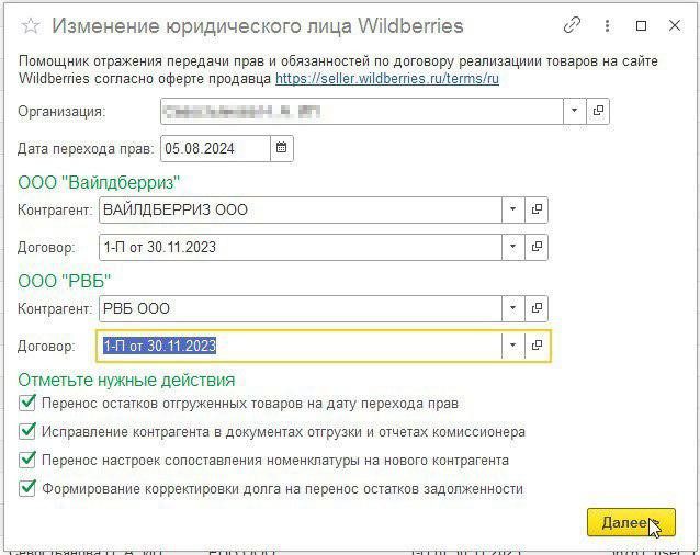 С 05.08.2024 года ООО «Вайлдберриз» передало права и обязанности по договору реализации товаров новому оператору – ООО «РВБ». Для корректного отражения этой операции в 1С:БП 3.0, выполните следующие шаги: